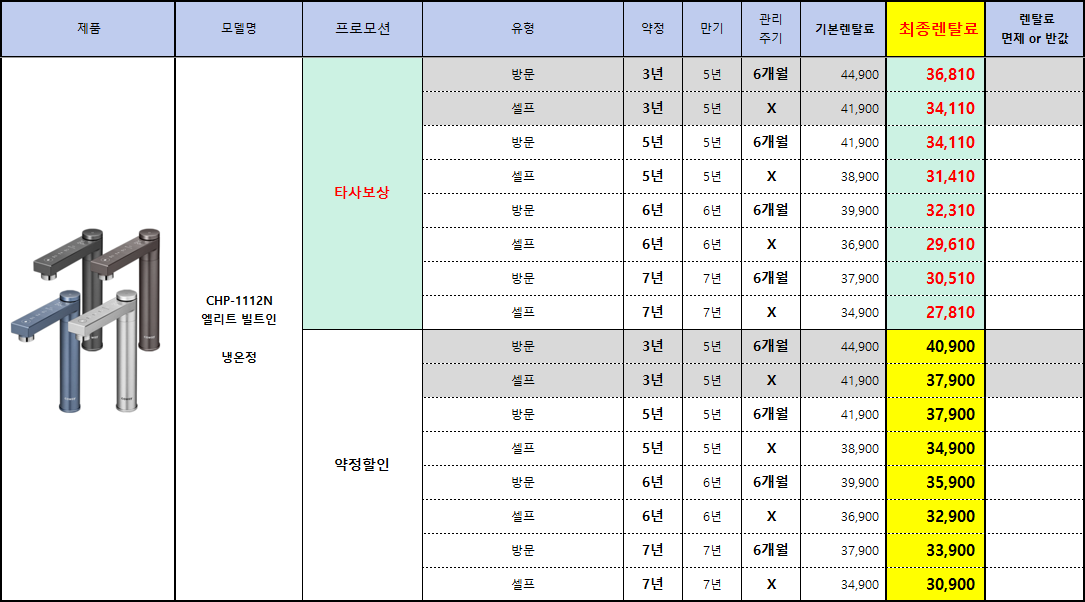 각 렌탈사의 월 렌탈료,제휴카드혜택,A/S기간,약정기간,혜택 등 비교하고 선택해 보세요.